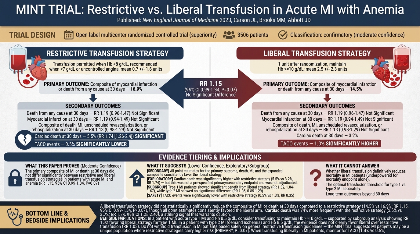 Restrictive or Liberal Transfusion Strategy in Myocardial Infarction and Anemia